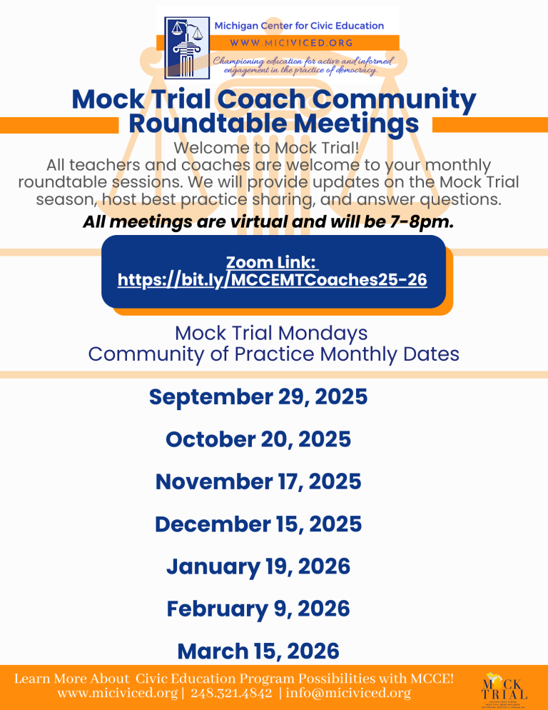 MCCE was created to be a premier organization dedicated to preparing an active and informed citizenry through law-related and civic education in Michigan.
